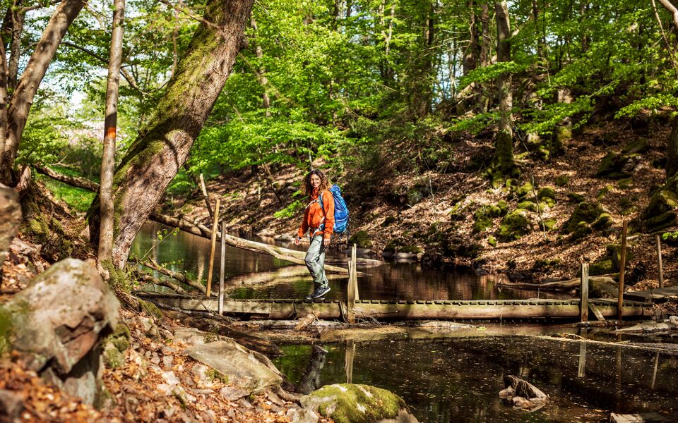 Vid Klöva hallar påbörjas vandringen genom Söderåsens väldiga bokskogar. Här upplever du också sprickdalen som sträcker sig flera kilometer in i åsen. Emellanåt får du tillfälle att blicka ut över ravinens branter. Ravinen sprack upp i samband med åsens bildande, för cirka 150 miljoner år sedan. Det var en turbulent tid då hela Skånes berggrund skakade.
